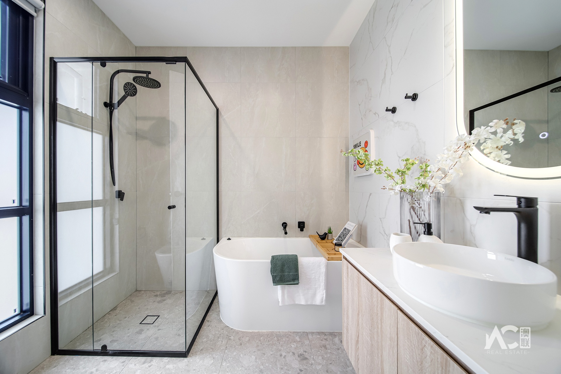 * Central family bathroom with separate bath and shower